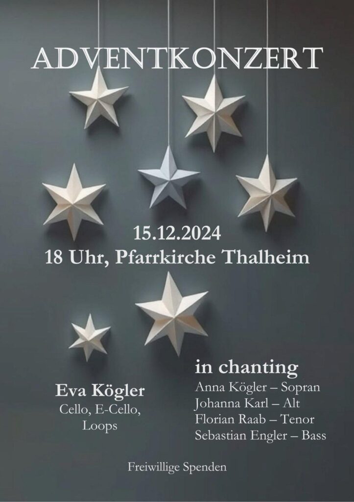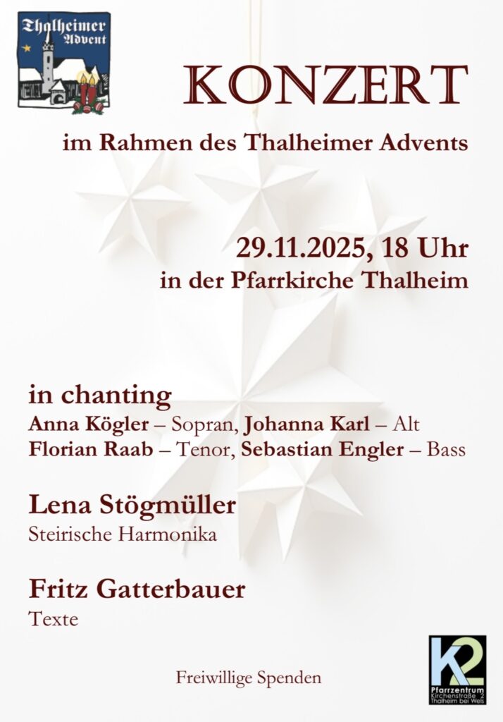 Im Rahmen des Thalheimer Advents gestalteten wir wieder ein Konzert in der Pfarrkirche. Die Programmgestaltung orientierte sich an der Weihnachtsgeschichte, von der Verkündigung der Geburt Christi in einer kalten Winternacht bis hin zum kleinen Jesuskind in der Krippe. Um das Konzert noch abwechslungsreicher zu gestalten las Fritz Gatterbauer drei adventliche Texte, wir musizierten auch verstärkt gemeinsam mit der Steirischen Harmonika. Von Volksliedern wie „Is finsta drausst“ über englische Renaissancemusik wie „God rest ye, merry gentleman“ bis hin zu John Taveners „The lamb“ war für jeden etwas dabei.