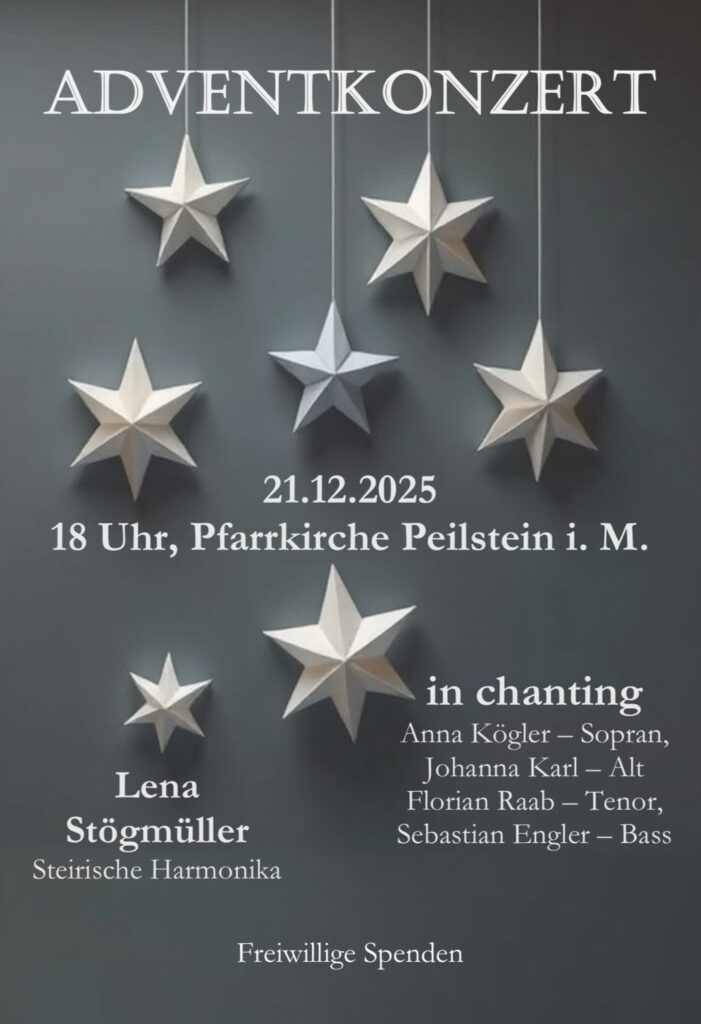 Wie schon im Vorjahr gestalteten wir in der Pfarrkirche Peilstein ein Konzert. Die Programmgestaltung orientierte sich an der Weihnachtsgeschichte, von der Verkündigung der Geburt Christi in einer kalten Winternacht bis hin zum kleinen Jesuskind in der Krippe. Um das Konzert noch abwechslungsreicher zu gestalten, las Rainer Raab drei adventliche Texte, wir musizierten auch verstärkt gemeinsam mit der Steirischen Harmonika. Von Volksliedern wie „Is finsta draußt“, über englische Renaissancemusik wie „God rest ye merry, gentlemen“, bis hin zu John Taveners „The lamb“ war für jeden etwas dabei.